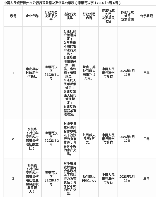 蓝鲸新闻1月14日讯,近日,中国人民银行漳州市分行发布了行政处罚信息,剑指华安县农村信用合作联社及其相关责任人。